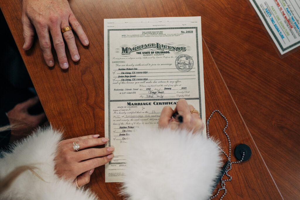 Before your marriage can be legal, you must obtain a marriage license from a County Clerk & Recorder office. Colorado does not require you to be a resident, making it a popular destination for elopements and destination weddings.